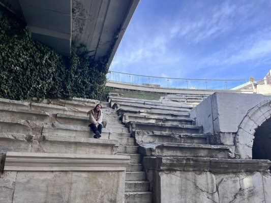 Plovdiv has a very interesting history. It claims to be the oldest living city in Europe. Its ancient name is Philippopolis and is a city which was occupied by the Macedonians, Thracians, Romans and later the Ottomans. There is an interesting video that we found that has an AI reconstruction of Plovdiv as a Roman city if you’re interested: Plovdiv video. During Roman occupation, many amazing constructs were built in the city including a fortress and walls, gates to the city, a theatre, an ampitheatre, a large stadium, a forum, temples and housing. Many of the ruins you can still see today. In fact, the Roman stadium is laying underneath the main pedestrian shopping street and you can see the ruins of it below the shops (see photo below of the ruins in the H&M clothing store)!
